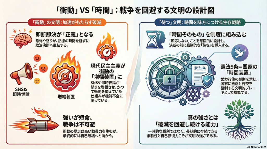 9条は単なる理想主義ではない。国家が武力行使に踏み切る前に、必ず立ち止まらされる構造――すなわち国家に強制的な「待ち時間」を課す時間装置である。即断即応を禁じ、熟慮と外交、国際的視線を挟み込む制度設計なのだ。