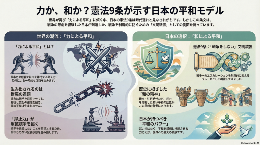 現代世界は、「力による平和」が再び主流となる時代に回帰しつつある。軍事力による威嚇が秩序を定め、従わない者は排除される。その構図は、かつての帝国主義時代を思わせるものであり、そこにあるのは真の安定ではなく、「恐怖による一時的な沈黙」に過ぎない。この大きな潮流の中で、日本の憲法9条は「時代遅れ」「非現実的」だと批判にさらされる。
