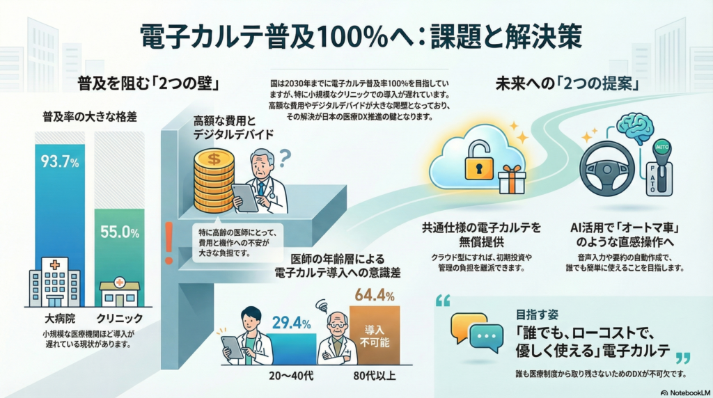 国は「医療DX令和ビジョン2030」で電子カルテ普及率100%を目標に掲げている。令和5年度の普及率は、大病院では93.7%に達しているが、クリニックでは55.0%に留まっている。メーカーごとに仕様が異なり、導入費用が高額であることが、小規模医療機関にとって大きな壁となっている。この課題に対し、国は「標準型電子カルテ」を開発し、無償提供する方針である。現在開発中のα版は、無床クリニック向けに外来診療の基本機能を備え、クラウド型を前提とする。国が共通機能を提供し、民間がオプションを組み合わせる仕組みで、全国医療情報プラットフォームとも連携する設計となっている。初期投資を抑えられるうえ、セキュリティや更新管理も容易で、普及拡大が期待されている。しかし普及を阻む第2の壁が、デジタルデバイド(情報格差)である。日本医師会の調査では「導入不可能」と回答した割合が20~40代で29.4%に対し、80代以上では64.4%に上り、世代間格差が明確である。高齢の医師にとって費用よりも運用不安が重く、スタッフも高齢であれば習熟に時間を要する。結果として電子カルテを導入しないまま引退を迎える例も少なくない。この壁を超えるにはAIを活用して操作を直感的かつ簡便にすることが必要である。音声認識による診療記録の自動入力や、サマリー・紹介状の作成をAIが担えば、「オートマ車のように誰でも扱える電子カルテ」となるだろう。日本医師会は「誰一人、日本の医療制度から取り残さない」ことを医療DXの大前提としている。真のデジタル化には、誰にとっても優しく、低コストで使える電子カルテの実現が不可欠である。(長野医報:2026年1月号:若里だより)